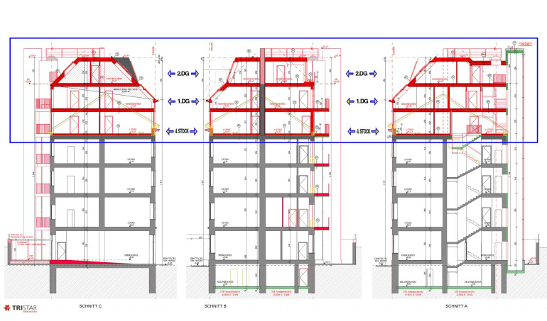 Im 4. Stock und im 1. Dachgeschoss entstehen großzügige 4-Zimmer-Wohnungen mit Balkonen, im 2. Dachgeschoss 3-Zimmer-Wohnungen mit Terrassen.