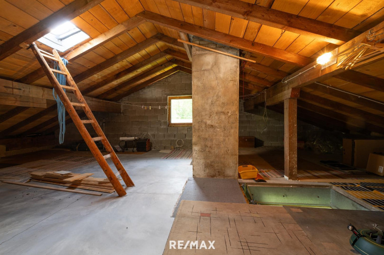 Im Obergeschoss: drei Schlafzimmer – zwei mit Balkon –, Bad mit Wanne, separates WC und Zugang zum Dachboden. Dieser ist bereits mit Strom- und Wasseranschlüssen ausgestattet und bietet viel Ausbaupotenzial.