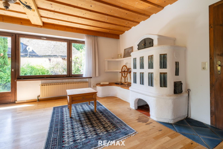 Im Erdgeschoss: Wohnzimmer mit Kachelofen, Küche, weiteres Zimmer mit Gartenzugang, Duschbad, separates WC.