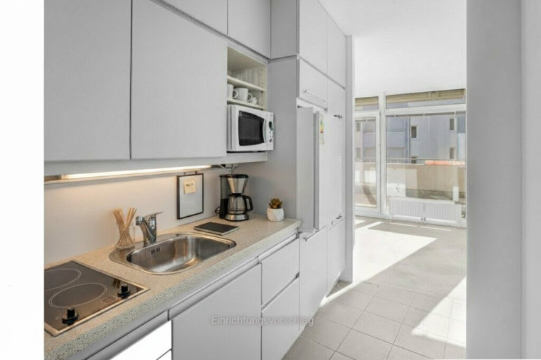 Die moderne Einbauküche lädt dazu ein, Pausen in einer angenehmen Atmosphäre zu verbringen, während der Personenaufzug den Zugang zum Bürokomfort für alle Mitarbeiter und Kunden erleichtert.