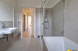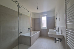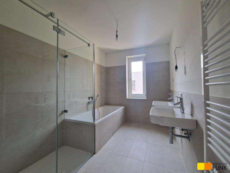 Im Obergeschoß erschließt der zentral angelegte Flur (ca. 6,44 m²) drei großzügige Schlafräume. Eines davon ist als Master-Bedroom (ca. 15,87 m²) mit Schrankraum geplant. Die beiden anderen Schlafzimmer weisen Flächen von ca. 12,50 m² und 12,28 m² auf. Ein lichtdurchflutetes Badezimmer (ca. 7,43 m²) mit Badewanne und Dusche, einem Doppelwaschtisch sowie einem Handtuchheizkörper finden Sie ebenso wie ein separates WC (ca. 1,84 m²) mit Handwaschbecken und einen zusätzlichen Abstellraum (ca. 2,83 m²).