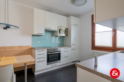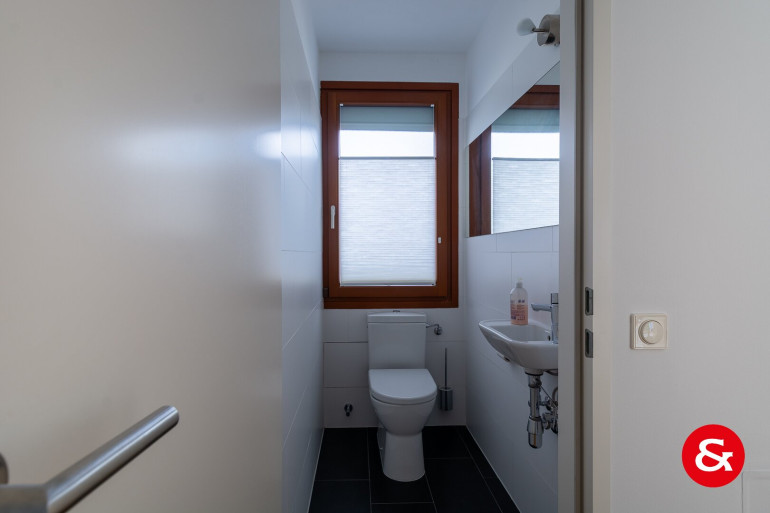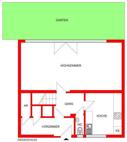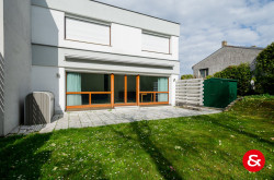 Im Erdgeschoß befindet sich das Vorzimmer mit ideal verbauten Stauräumen, teilweise unter der Treppe, eine Gästetoilette, eine modern eingerichtete Küche mit kleinem Essplatz, ein rechteckiger großer Wohnraum mit wunderschöner Glasfront Richtung südlich angelegten Garten.
