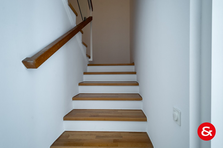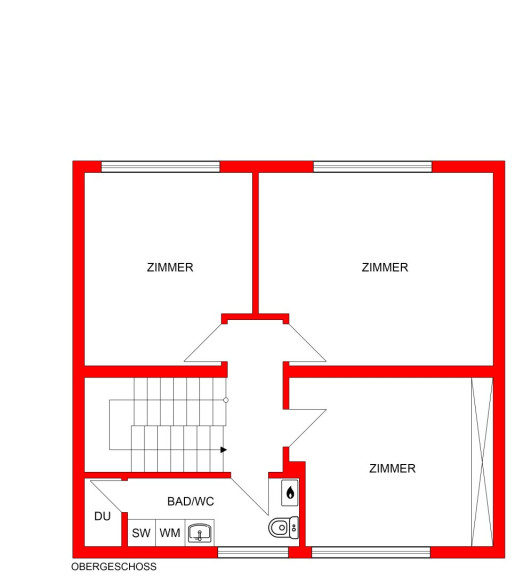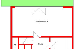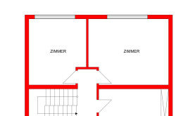 Im Obergeschoß sind drei Zimmer, zwei davon mit Fenstern in den Gartenteil. Ein großes Badezimmer mit Fenster vervollständigt das Geschoß.