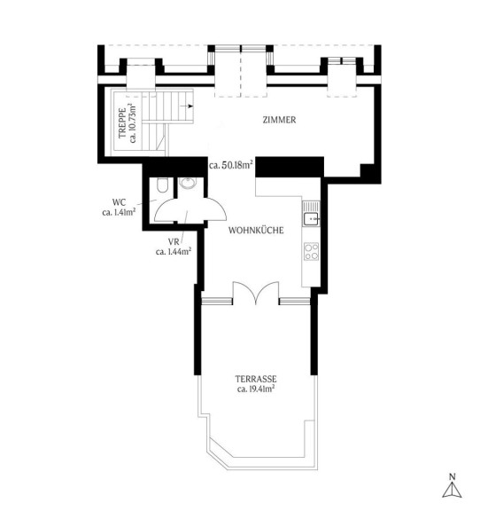 Die Wohnfläche erstreckt sich über zwei Ebenen. Auf der unteren Ebene befinden sich zwei geräumige Zimmer. Der Vorraum ist teilbar in ein weiteres Zimmer, das sich flexibel als Schlaf-, Arbeits- oder Gästezimmer nutzen lässt. Ein modernes Badezimmer mit Walk-in-Dusche, Badewanne und Doppelwaschbecken bietet komfortablen Rückzugsraum, ergänzt durch eine separate Toilette sowie praktische Abstellflächen. Die klaren Linien und die ausgewählten Materialien verstärken den harmonischen Gesamteindruck. Die obere Ebene bildet den kommunikativsten Teil der Wohnung: Ein großzügiger, lichtdurchfluteter Wohnbereich geht fließend in die modern ausgestattete Wohnküche über. Von hier aus gelangt man direkt auf die südlich ausgerichtete Terrasse – ein ruhiger, sonnendurchfluteter Außenbereich über den Dächern des 7. Bezirks, ideal für entspannte Stunden im Freien, urbanes Gärtnern oder gesellige Abende mit Freunden. Hochwertiger Parkettboden, großzügige Fensterflächen, durchdachte Raumproportionen und Klimaanlage verleihen der gesamten Wohnung ein warmes und einladendes Wohngefühl. Die wertige Küche ist modern ausgestattet und bietet viel Stauraum sowie ausreichend Platz zum Kochen und Genießen. Ein Kellerabteil sorgt für zusätzlichen Stauraum. Diese Maisonette eignet sich ideal für Menschen, die Ruhe, Licht, Großzügigkeit und eine elegante Wohnatmosphäre schätzen – und gleichzeitig die urbane Vielfalt und Lebendigkeit des 7. Bezirks in unmittelbarer Nähe wissen möchten. Ein Zuhause, das stilvollen Rückzug und innerstädtisches Lebensgefühl auf besondere Weise miteinander verbindet. Die Betriebskosten betragen (inkl. Rücklage und USt.) ca. € 437 pro Monat.