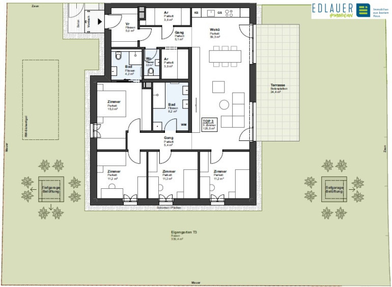 Die im Erdgeschoß geplante Wohnung Top 3 (Lift ist vorhanden) mit ca. 125,5 m² Wohnnutzfläche, einer Terrasse von ca. 24,4 m² und einem Garten mit ca. 339,4 m² verfügt über folgende Raumaufteilung: