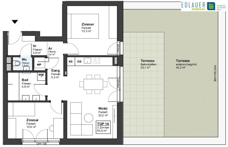 Die im Dachgeschoß geplante Wohnung Top 14 (Lift ist vorhanden) mit ca. 63,6 m² Wohnnutzfläche und einer Terrasse mit ca. 65,3 m² verfügt über folgende Raumaufteilung:
