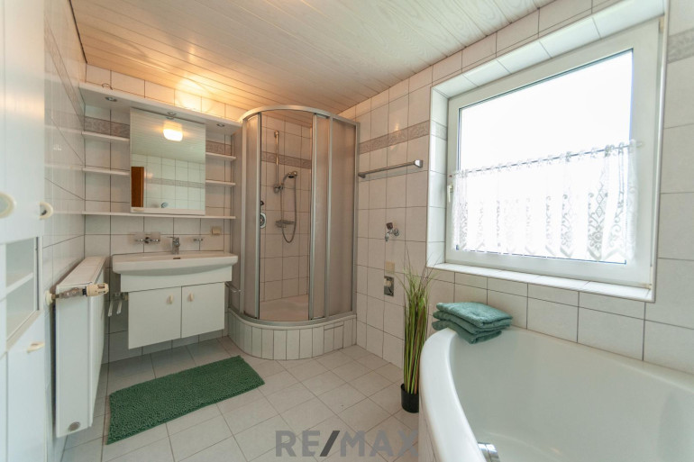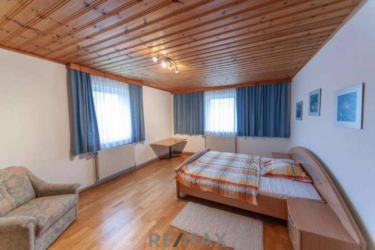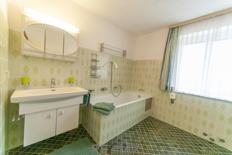 Das Obergeschoss, welches als eigene Wohneinheit genützt werden kann, bietet eine zusätzliche kleine Küche mit Essbereich sowie drei geräumige Schlafzimmer. Auch hier finden Sie ein Badezimmer mit Badewanne und Dusche sowie ein separates WC. Über eine ausziehbare Treppe gelangen Sie auf den Dachboden, der praktischen Stauraum bietet. Das Gebäude ist teilweise unterkellert, und unter dem rund 40 m² großen Balkon befindet sich weiterer Platz für Gartengeräte oder andere Dinge.