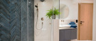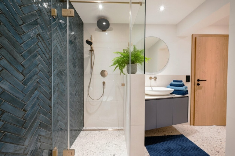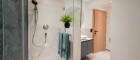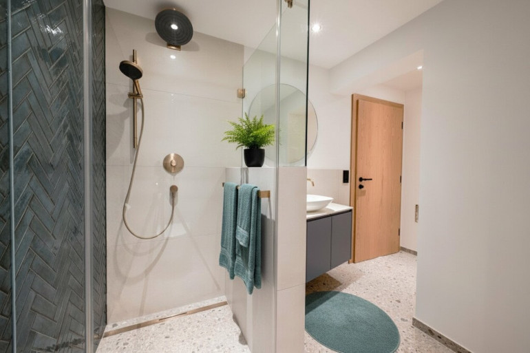- Badezimmer mit Regendusche, Waschtisch, Handtuchtrockner, WC und Waschmaschinenanschluss