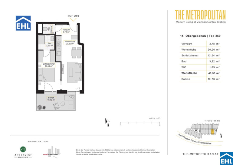 Das moderne Wohnbauprojekt „METROPOLITAN – Modern Living“ befindet sich im aufstrebenden und lebendigen Sonnwendviertel, nur wenige Gehminuten vom neu errichteten Hauptbahnhof entfernt. Die Lage bietet eine hervorragende Infrastruktur mit zahlreichen Einkaufsmöglichkeiten, Restaurants und Cafés in der Umgebung. Besonders hervorzuheben ist die Nähe zum Helmut-Zilk-Park, der Erholung und Freizeitspaß für die ganze Familie bietet.