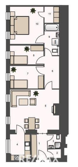 Die Wohnung ist aufgeteilt in ein großflächiges Wohnzimmer mit drei Schlafzimmern, eines der Schlafzimmer ist mit einem Schrankraum ausgestattet, zwei Badezimmern, eines mit einer Badewanne und ein weiteres mit einer Dusche ausgestattet, einem separaten WC, eine separate Küche sowie einen Abstellraum.