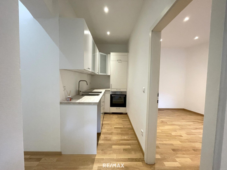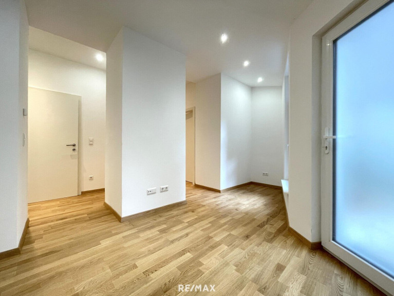 Aus dem Vorraum gelangen Sie in die ca. 20 m² große Wohnküche mit Ausgang in den eigenen, ca. 28 m² großen, hofseitigen Garten sowie das ca. 10 m² große Schlafzimmer, welches ebenfalls über einen Ausgang in den Garten verfügt.