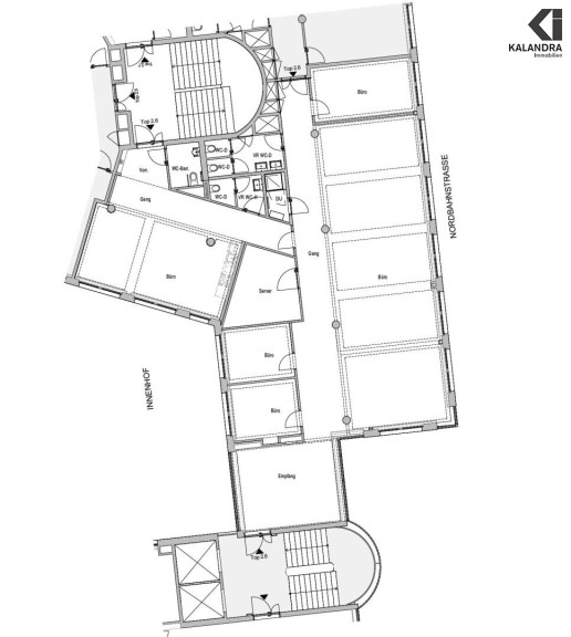Vorraum, großer Empfang, 4-8 Büroräume, Küche, Badezimmer, 4 WC, ein Duschbad, Lager-/ Serverraum.