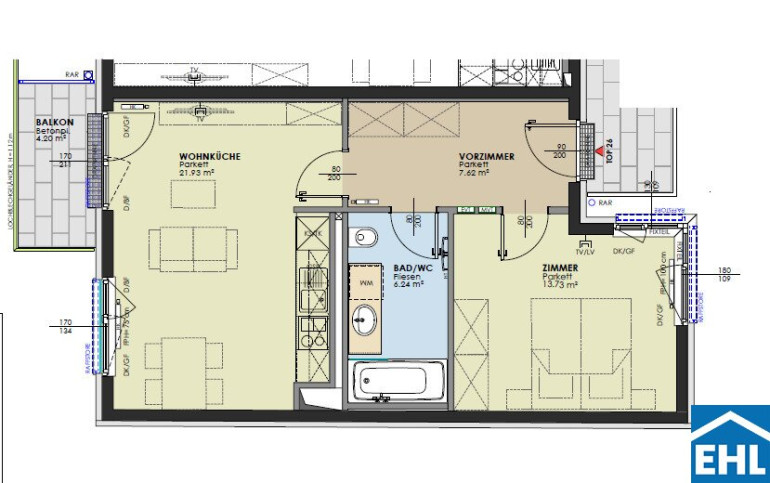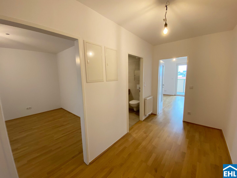 Die Wohnung selbst befindet sich im 4. Obergeschoss und verfügt über eine großzügige Wohnküche, ein Schlafzimmer, ein Badezimmer mit Wanne, WC und Waschmaschinenanschluss und einen Vorraum. Die Freifläche lädt zum Beisammensein ein und rundet das Wohnerlebnis perfekt ab.