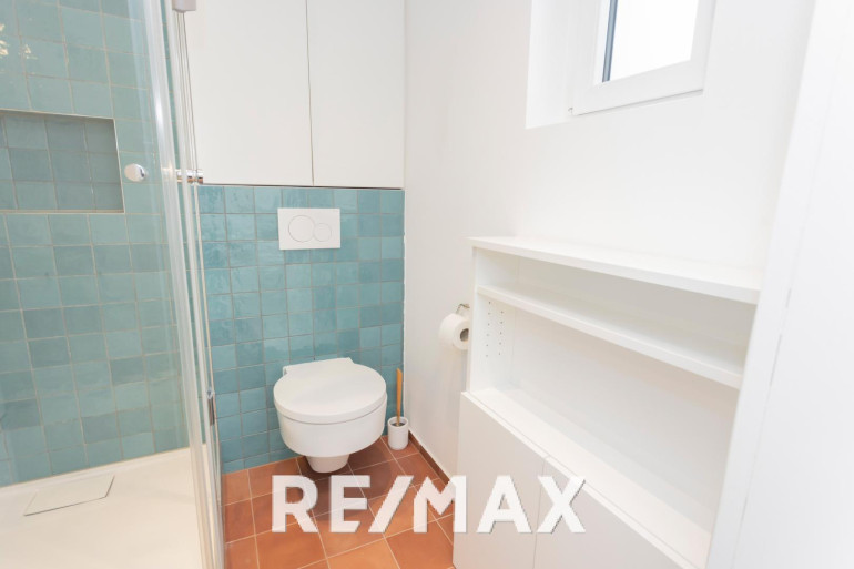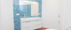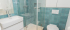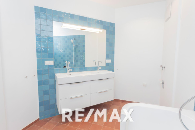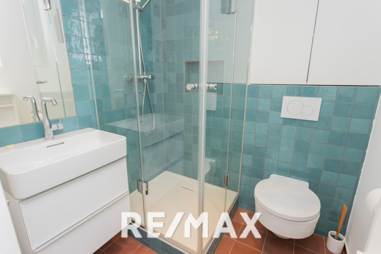 Edle Materialien: handgemachte Wand- und Bodenfliesen in den Nassräumen, hochwertiger Laminatboden in Eichenoptik