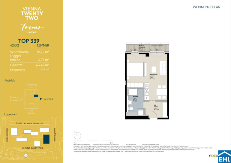 In einzigartiger Lage, direkt bei der U1-Station Kagran und vis-à-vis vom Donau Zentrum, entsteht ein exklusiver, ca. 155m hoher Wohnturm mit 45 Etagen. Die insgesamt 347 Mietwohnungen bieten einen vielfältigen Wohnungsmix: von smart geschnittenen 1,5-Zimmer-Apartments ab ca. 38 m² über komfortable 2-Zimmer-Wohnungen bis hin zu großzügigen 3- und 4-Zimmerwohnungen mit bis zu ca. 80 m².