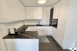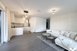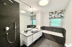 Über eine im Winter beheizte Rampe gelangen Sie zum überdachten Stellplatz, wo Sie mit dem Personenaufzug bequem den ersten und untersten Wohn-Stock des Hauses erreichen. Der offene Eingangsbereich bietet Platz für eine moderne Garderobe. Im Eingangsbereich befindet sich die imposante Gäste-Toilette sowie das Badezimmer. Dieses ist mit hochwertigen Armaturen, einer bodengleichen Dusche, einer Badewanne sowie einem Waschbecken mit Waschtisch und Fenster ausgestattet. Ein großes Schlafzimmer sowie ein Kinderzimmer befinden sich gleich nebenan. über den offenen Flur gelangen Sie in das Herzstück der edlen Wohnung - die großzügige Wohnküche. Ausgestattet mit einer Designerküche und allen benötigten Geräten genießen Sie die stilvolle Atmosphäre und entschleunigende Momente auf dem knapp 12 qm großen Balkon, dieser ist über eine große Schiebe-Glasfront zugänglich.