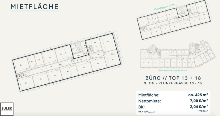 Die Liegenschaft umfasst zwei Gebäudeteile: das repräsentative Gründerzeithaus „Fröhlich Hof“ an der Hütteldorfer Straße sowie einen modernen Neubau in der ruhigeren Plunkergasse – ein attraktiver Standort für vielseitige gewerbliche Nutzungen.