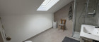 OG: Wohnzimmer mit Balkon, Badezimmer mit Dusche und WC, Schlafzimmer, Küche mit Essbereich