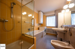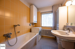 - ein Badezimmer mit Badewanne, Dusche, Waschmaschinen-Anschluss, Warmwasserboiler, WC und Handwaschbecken