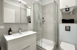 Das Badezimmer wurde im Zuge der Renovierung neu eingebaut und wurde neben Dusche, Waschtisch und WC (hochwertige Markenprodukte von Villeroy&Boch, Laufen u. Regenwerk) mit geschmackvollen Feinsteinzeug-Fliesen in Naturtönen aus Italien ausgestattet.
