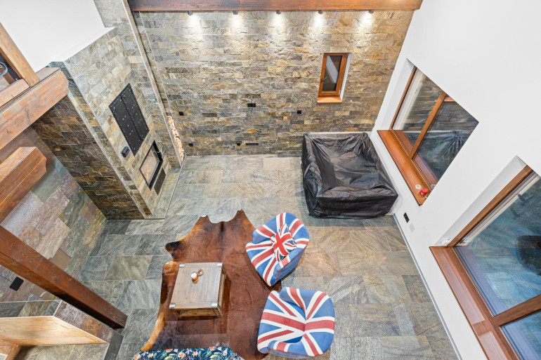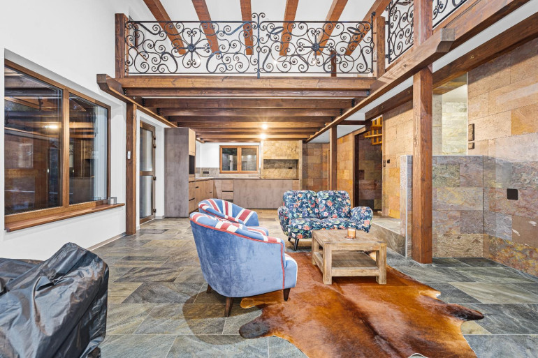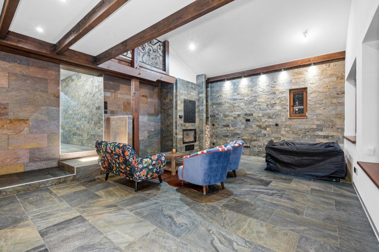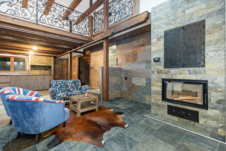 - Großzügiges Wohnzimmer mit offener Küche, Kamin mit wasserführendem Einsatz (Aquatic VH80), Jaccuzi und Zugang zur Terrasse