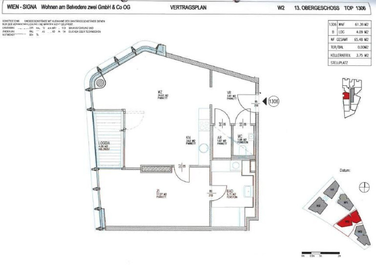 | W2 | 13te Etage | TOP 1306 | 61,4 WNFL + 4,09 Loggia | VKP 491.120 Euro | Mietvertrag bis 30.09.2028 |