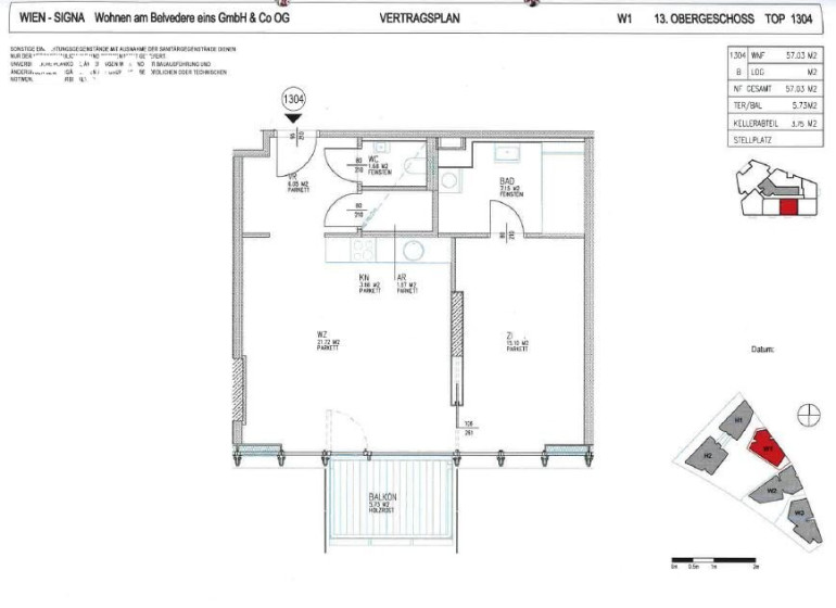 | W1 | 13te Etage | TOP 1304 | 57,3 WNFL + 5,73 Terrasse | VKP 458.760 Euro | Mietvertrag bis 27.02.2028 |