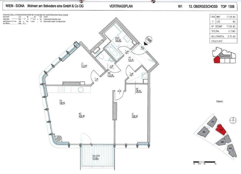 | W1 | 13te Etage | TOP 1306 | 77,9 WNFL + 5,73 Terrasse | VKP 616.720 Euro | Mietvertrag bis 31.05.2027 |