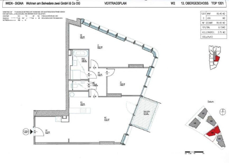 | W2 | 12te Etage | TOP 1201 | 95,4 WNFL + 6,15 Terrasse | VKP 734.580 Euro | Mietvertrag bis 31.03.2029 |