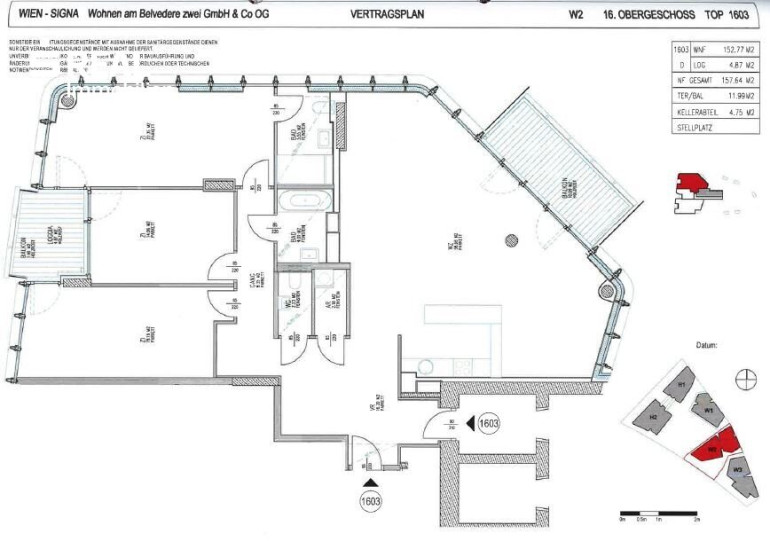 | W2 | 16te Etage | TOP 1603 | 152,7 WNFL + 11,9 Terrasse + 4,87 Loggia | VKP 1.398.394 Euro | Mietvertrag bis 30.04.2026 |