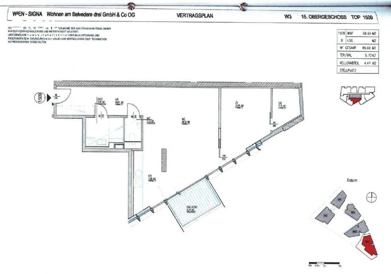 | W3 | 15te Etage | TOP 1509 | 69,7 WNFL + 5,70 Terrasse | VKP 591.643 Euro | Mietvertrag bis 31.10.2027 |