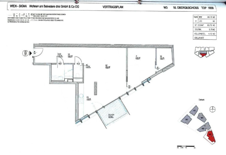| W3 | 16te Etage | TOP 1609 | 69,7 WNFL + 5,70 Terrasse | VKP 522.750 Euro | Mietvertrag bis 18.12.2026 |
