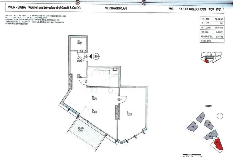 | W3 | 17te Etage | TOP 1709 | 69,6 WNFL + 5,70 Terrasse | VKP 629.236 Euro | Mietvertrag bis 31.12.2028 |