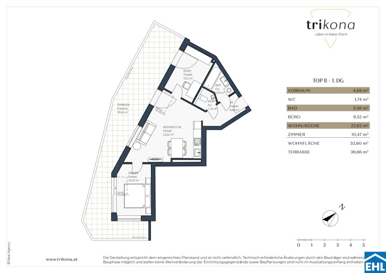 Das besondere Merkmal des Gebäudes ist sein außergewöhnlicher dreieckiger Baukörper. Durch die clevere Nutzung der herausfordernden Grundstücksform wurde eine einzigartige Architektur geschaffen, die sowohl ästhetisch ansprechend als auch funktional ist. Die durchdachte Raumaufteilung innerhalb des dreieckigen Grundrisses sowie die nachhaltige Holz-Hybrid-Bauweise sorgen für eine effiziente Nutzung des Platzes und bieten den Bewohnern ein komfortables, vielseitiges Wohnerlebnis. Jeder Winkel des Gebäudes wurde sorgfältig gestaltet, um maximale Flexibilität und Wohnqualität zu gewährleisten. Mit der Kombination aus Holz & Stahlbeton ist für maximale Stabilität bei gleichzeitig hervorragender Ökobilanz gesorgt. Das angenehme, natürliche und gesunde Raumklima mit der hervorragenden Wärmedämmung & Energieeffizienz sorgen dauerhaft für ein gutes Wohngefühl. Mit nur 12 Wohnungen bietet dieses Projekt ein Leben mit Privatsphäre und Ruhe.