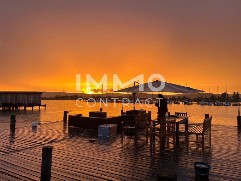 Bootshaus mit Garage, Kran, Wohnflächen und Terrassen mitten am See
