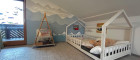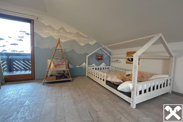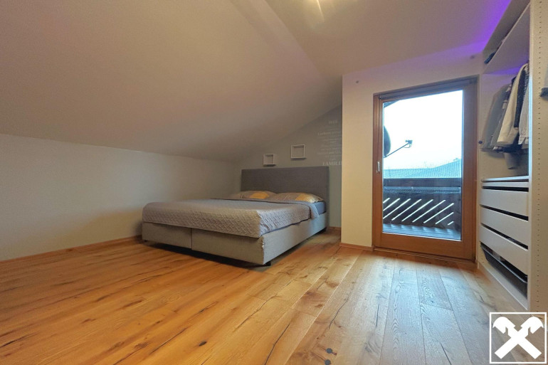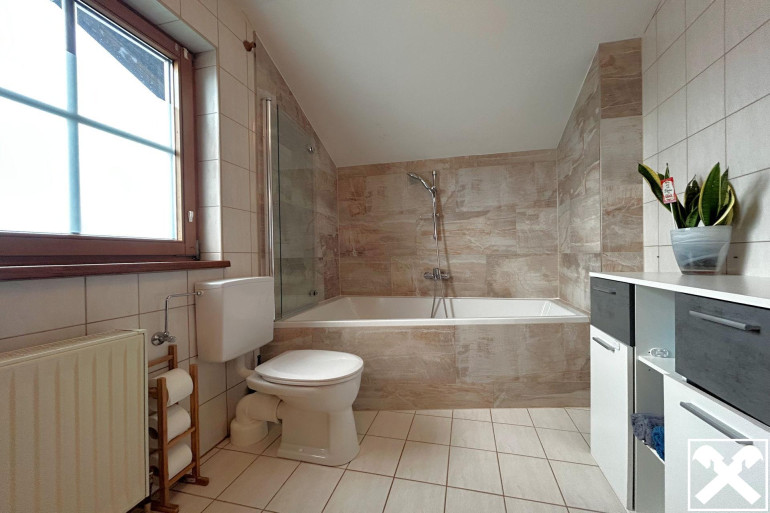 Im Erdgeschoss befinden sich die Küche und der große Wohnbereich, der dank Erkern und einem großen Kachelofen besonders gemütlich ist. Vorbei an der Garderobe und dem Gäste-WC gelangt man in das obere Stockwerk. Die Dachschrägen versprühen hier ein wohnliches Flair, ohne Platz wegzunehmen. In dieser Etage befinden sich drei Schlafzimmer - zwei davon mit Zugang zum Balkon - sowie das große Badezimmer.