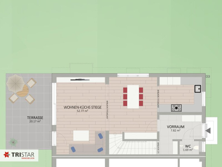 Die Terrasse bietet Ihnen den perfekten Ort, um die warmen Sommerabende im Freien zu genießen. Stellen Sie sich vor, wie Sie mit Freunden und Familie bei einem Grillabend den Ausblick ins Grüne genießen – ein wahrer Rückzugsort, der zum Verweilen einlädt.