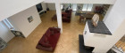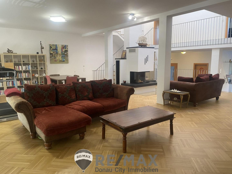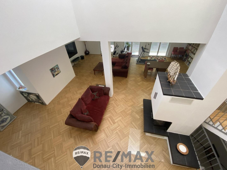 In der Mitte des Wohn- und Essbereichs ist ein Kamin integriert. Man befindet sich in einer architektonisch raffinierten Raumgestaltung, in der es freie Sicht bis zu 10m hinauf zu den Dachflächenfenstern gibt.