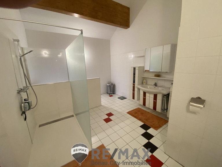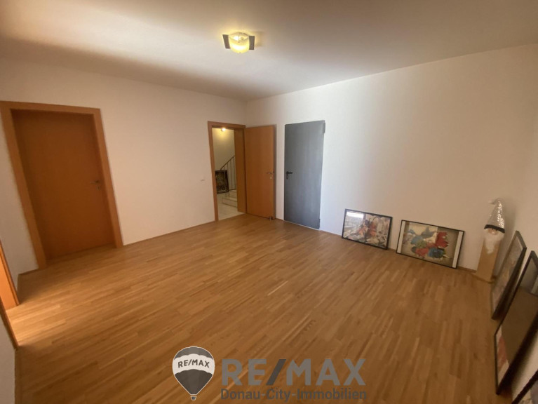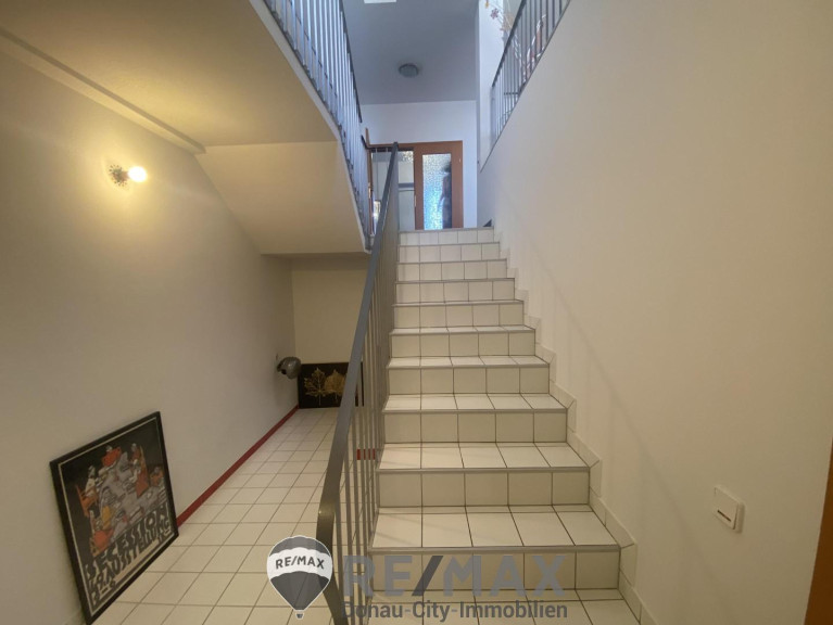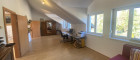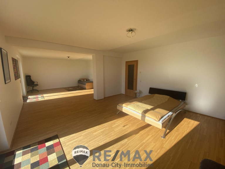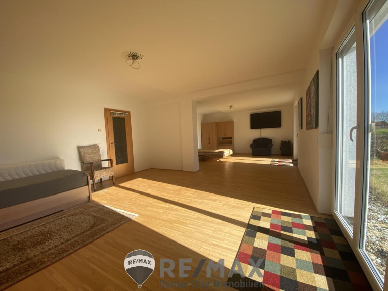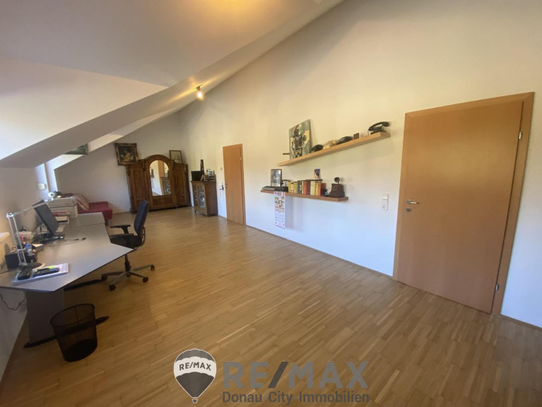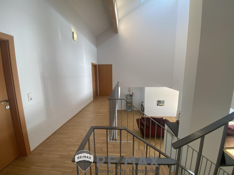 Ins Obergeschoss gelangt man über eine offene Treppe zu einer Balustrade mit Blick hinunter ins Wohnzimmer und Zugang zu einem ca. 40m² großen nordseitigen Arbeitszimmer, das sich durch Einziehen einer Zwischenwand in zwei getrennt begehbare Räume verwandeln lässt. Dank des schnellen Internets über das Glasfaserkabel (150 Mbps Download + 50 Mbps Upload) eignet sich der Standort perfekt für ein Home Office. Von der Balustrade führen Treppen ins Badezimmer, bzw. direkt in das große Schlafzimmer, von dem aus man auf den südseitig gelegenen Balkon kommt, um die grandiose Aussicht über viele Kilometer hinweg, an klaren Tagen bis hin zum Schneeberg, genießen kann...