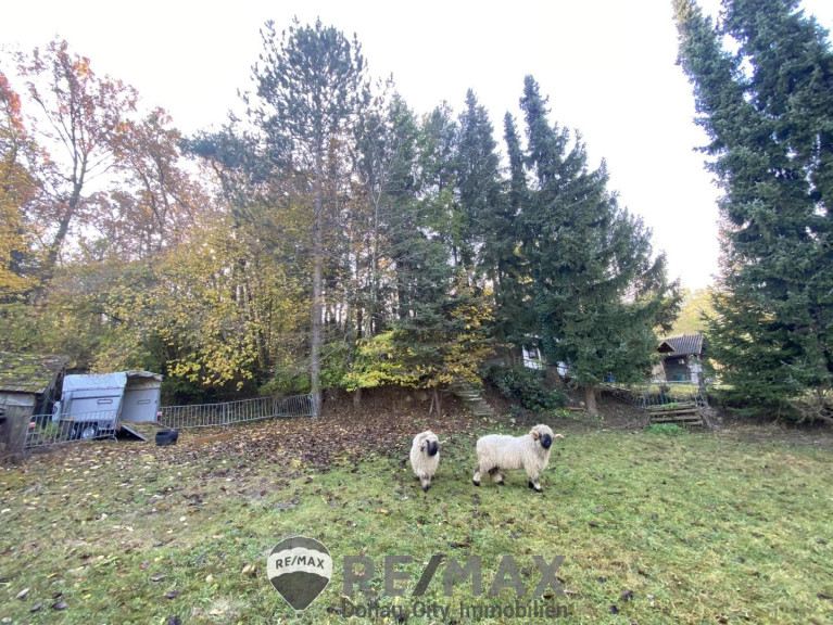 Das Haus liegt in leichter Hanglage direkt hinter dem ca. 6.700m² großen und schönen Mischwald halb umgeben von einer ca. 1.800m² großen Wiesen- oder Weidefläche.