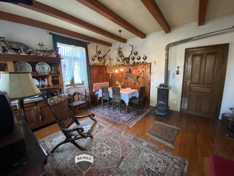 Geheizt und gekocht kann mit Holz werden, dafür sorgen der klassische Holzherd in der Küche und der Holzofen im Wohnzimmer. Über den Kamin wird auch das Dachgeschoss mitbeheizt. Holz steht über den angrenzenden Wald im Überfluss zur Verfügung. Als zusätzliche oder alternative Heizung kann man auf Strom zurückgreifen. Eine einfache Dusche und WC finden sich im Erdgeschoss.
