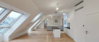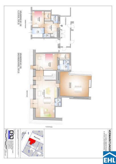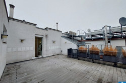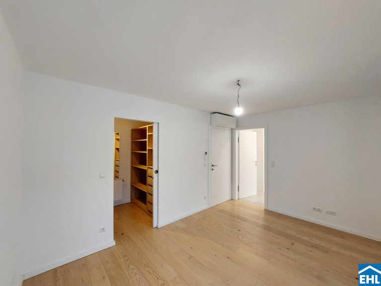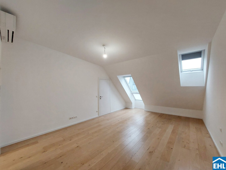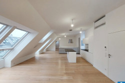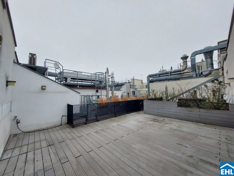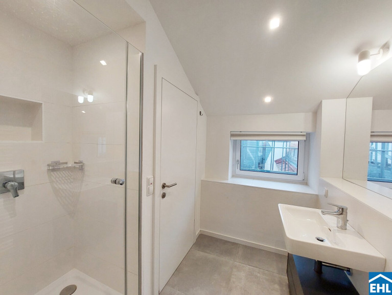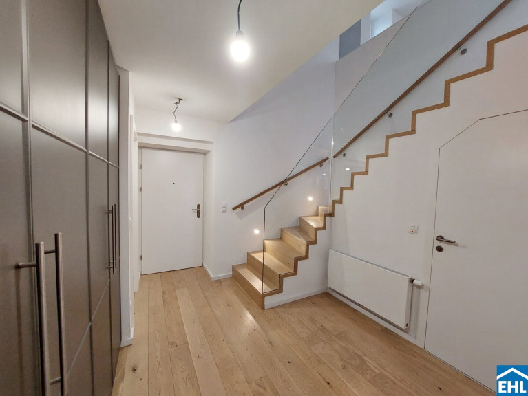 Die Wohnung befindet sich in der 6. Etage und gliedert sich in eine großzügige Wohnküche mit eigenem separaten WC, eine vollausgestattete Einbauküche, zwei separat begehbare Schlafzimmer, wobei eines der beiden in dem höheren Geschoss liegt (beide davon mit Schrankraum), ein Badezimmer mit Doppelhandwaschbecken Dusche und Badewanne, sowie ein zweites Bad mit Dusche und abgetrennter Toilette. Zusätzlich ein weiters separates WC unter dem Stiegenaufgang zum oberen Geschoss, einen Abstellraum mit Waschmaschinenanschluss, sowie einen Vorraum. Die sonnige Terrasse umfasst eine großzügige mit Holzlattenrost überzogene Fläche und lädt zum gemütlichen Verweilen im Freien ein.