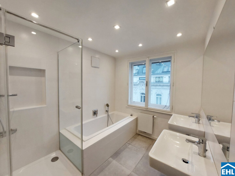 Fliesen, Parkett, Gas, Etagenheizung, Einbauküche, Wohnküche / offene Küche, Personenaufzug, Ostbalkon, Badewanne, Dusche