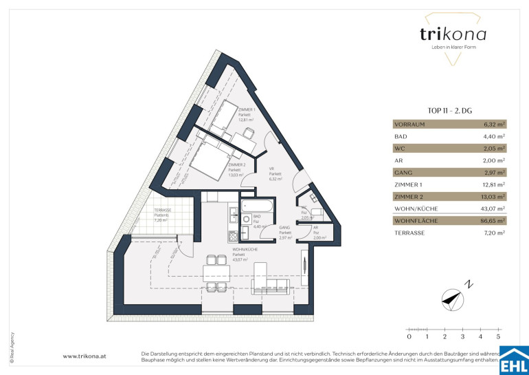 Das besondere Merkmal des Gebäudes ist sein außergewöhnlicher dreieckiger Baukörper. Durch die clevere Nutzung der herausfordernden Grundstücksform wurde eine einzigartige Architektur geschaffen, die sowohl ästhetisch ansprechend als auch funktional ist. Die durchdachte Raumaufteilung innerhalb des dreieckigen Grundrisses sowie die nachhaltige Holz-Hybrid-Bauweise sorgen für eine effiziente Nutzung des Platzes und bieten den Bewohnern ein komfortables, vielseitiges Wohnerlebnis. Jeder Winkel des Gebäudes wurde sorgfältig gestaltet, um maximale Flexibilität und Wohnqualität zu gewährleisten. Mit der Kombination aus Holz & Stahlbeton ist für maximale Stabilität bei gleichzeitig hervorragender Ökobilanz gesorgt. Das angenehme, natürliche und gesunde Raumklima mit der hervorragenden Wärmedämmung & Energieeffizienz sorgen dauerhaft für ein gutes Wohngefühl. Mit nur 12 Wohnungen bietet dieses Projekt ein Leben mit Privatsphäre und Ruhe.