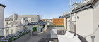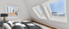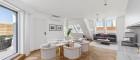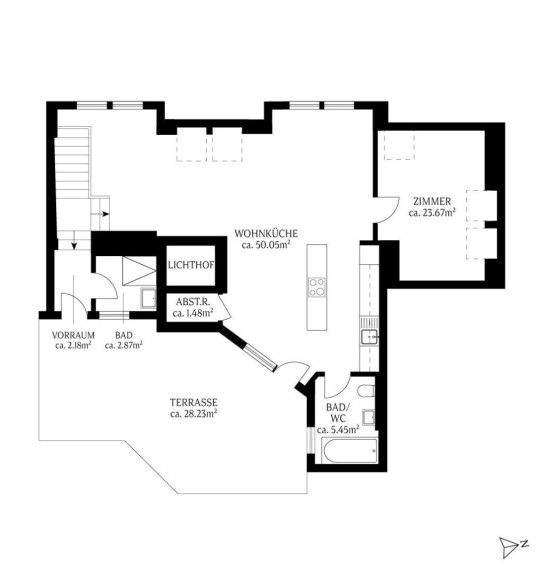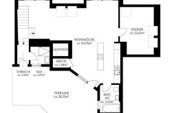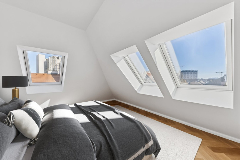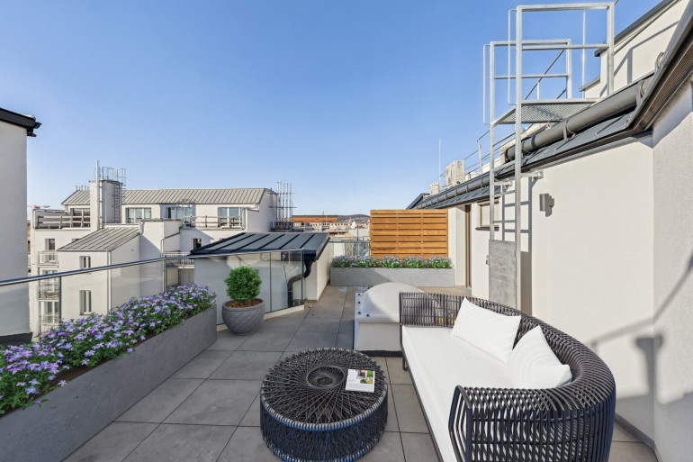 Auf einer Wohnfläche von rund 126 m² finden Sie ein repräsentatives, großes Foyer mit einer auffällig gestalteten offenen Treppe, einen überaus großzügig bemessenen und offen angelegten Wohn-Ess-Küchenbereich mit angrenzender Terrasse von rund 28 m2, Abstell-/Haustechnikraum, Gästetoilette, zwei geräumige Schlafzimmer sowie zwei luxuriöse Badezimmer mit Walk-In-Dusche bzw. Badewanne. Der Blick von der Terrasse, die ausreichend Platz für Außenküche und Lounge bietet, öffnet sich über den ruhigen Innenhof und die umliegenden Dächer der Stadt.