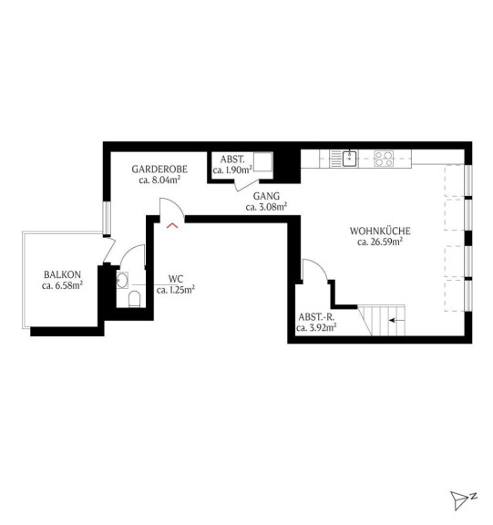 Auf einer Wohnfläche von rund 74 m² finden Sie ein einladendes Foyer, einen großzügigen Wohn-Ess-Küchenbereich, einen Balkon von rund 6 m2, Abstellraum, Gästetoilette sowie Haustechnikraum, darüber hinaus eine großzügig angelegte Schlafzimmer-Suite mit luxuriösem Badezimmer und einer Terrasse von rund 16 m2. Der Blick öffnet sich über den ruhigen Innenhof und die umliegenden Dächer der Stadt.