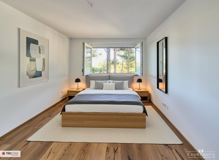 Zur hochwertigen Ausstattung gehören Eichenparkettböden, Vorbereitung für Klimaanlage, Kunststoff-Alu-Fenster mit 3-fach Isolierverglasung und mit integriertem Sonnenschutz.