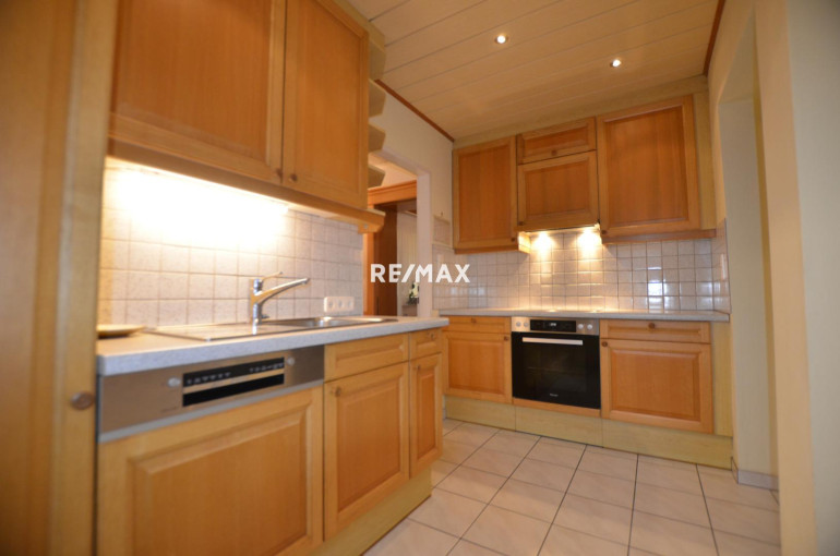 Die 2024 erneuerte, funktionelle Küche grenzt unmittelbar an den großzügigen 38 m² Wohnbereich, der durch einen imposanten Kachelofen zusätzlich beheizt wird und für behagliche Wärme sorgt.