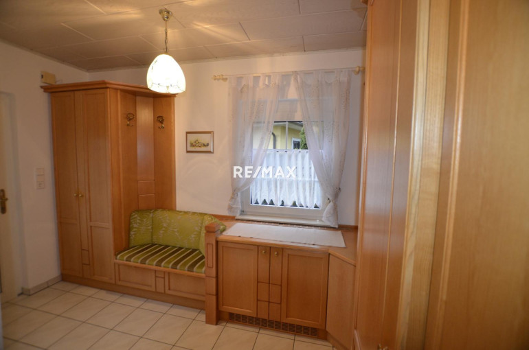 Der gepflegte Garten führt Sie in den Vorraum mit Garderobe. Hier befinden sich eine Toilette, ein Waschbecken sowie die Waschmaschine (im Haus verbleibend).