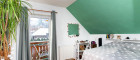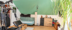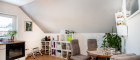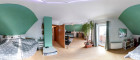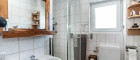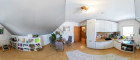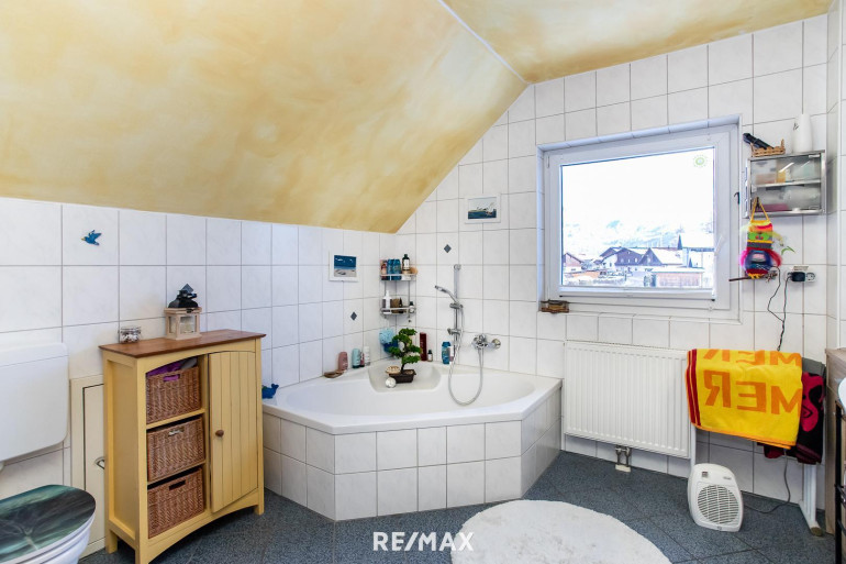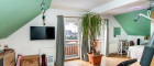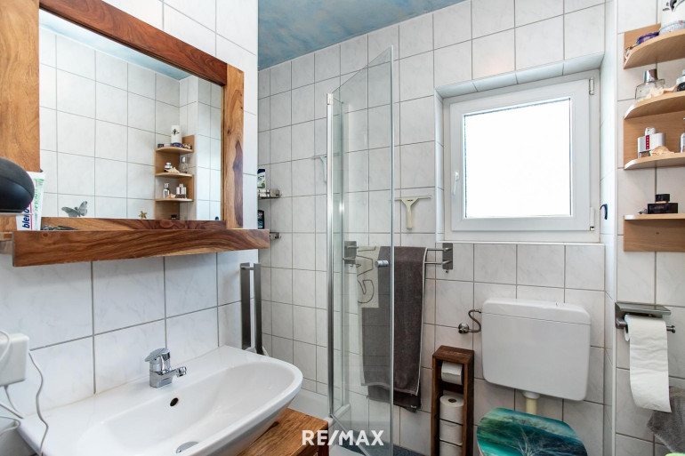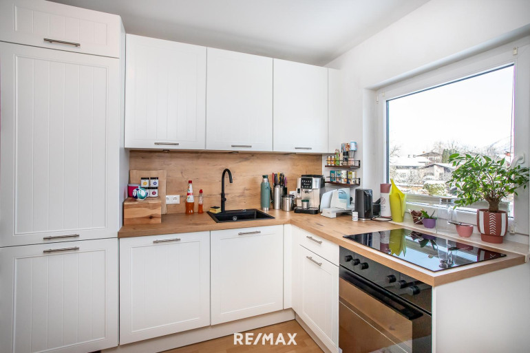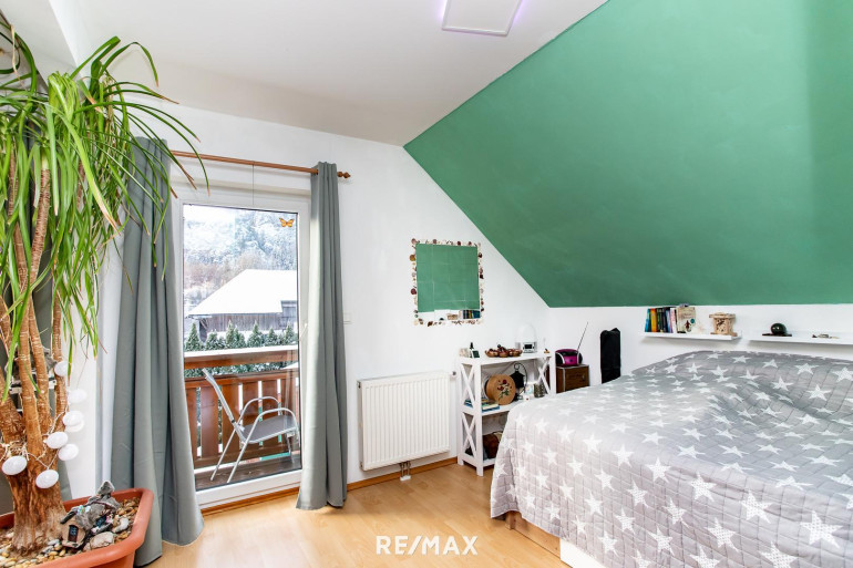 Über die Treppe gelangt man in das Obergeschoss, das mit einem Wohn- und Schlafraum eine gemütliche, eigenständige Wohnetage bildet, dessen beide Haupträume direkten Zugang zum Balkon haben – ein Ort der Leichtigkeit mit schönem Ausblick. Angrenzend sorgt ein Schrankraum für Ordnung und zusätzlichen Komfort. Die Küche bietet ausreichend Platz zum Kochen und Essen und lässt sich dank ihrer vorteilhaften Größe und Schnittführung optimal möblieren. Das Badezimmer mit Badewanne und WC bietet einen ruhigen Rückzugsort zum Entspannen und Auftanken. Ergänzt wird diese Ebene durch die beiden Seitenböden, in denen all die Dinge ihren Platz finden, die zwar selten in die Hand genommen, aber dennoch wichtig sind. Zusätzlich bietet der Dachboden wertvolle Abstellfläche für alles, was nicht täglich benötigt wird.